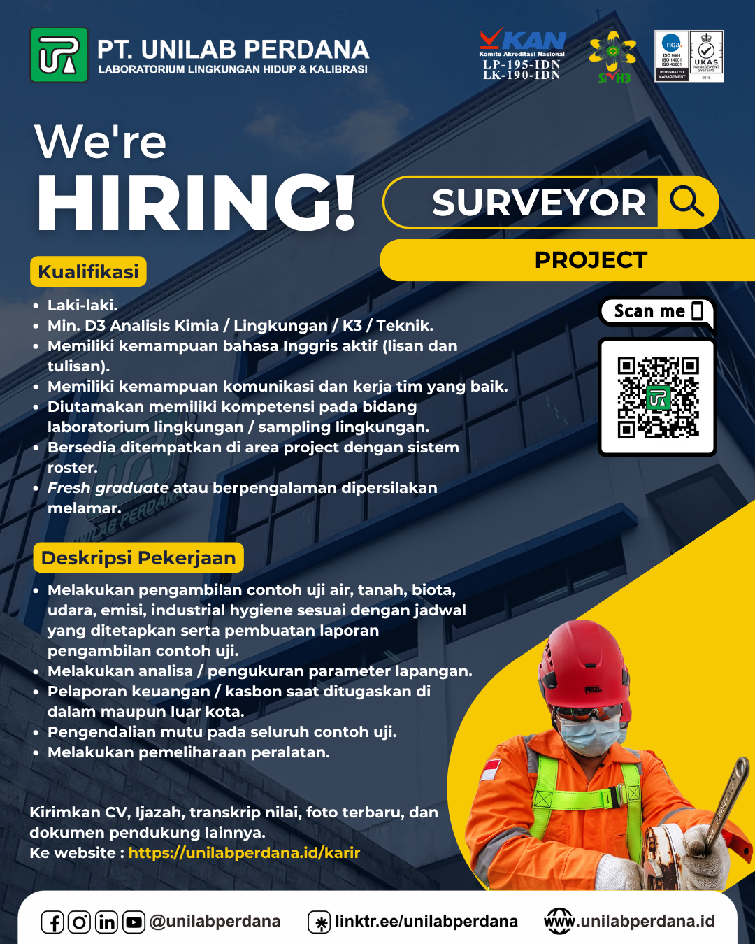 5. Diutamakan memiliki kompetensi pada bidang laboratorium lingkungan / sampling lingkungan.